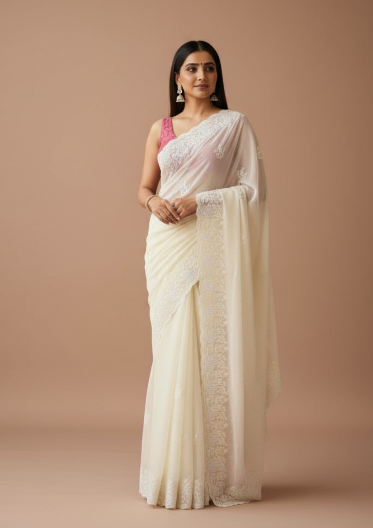Pure chiffon with small floral embroidery work on body and heavy embroidered border