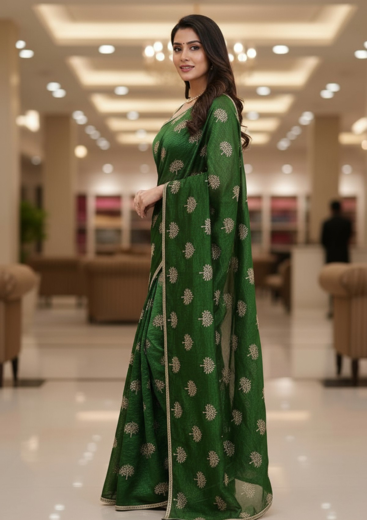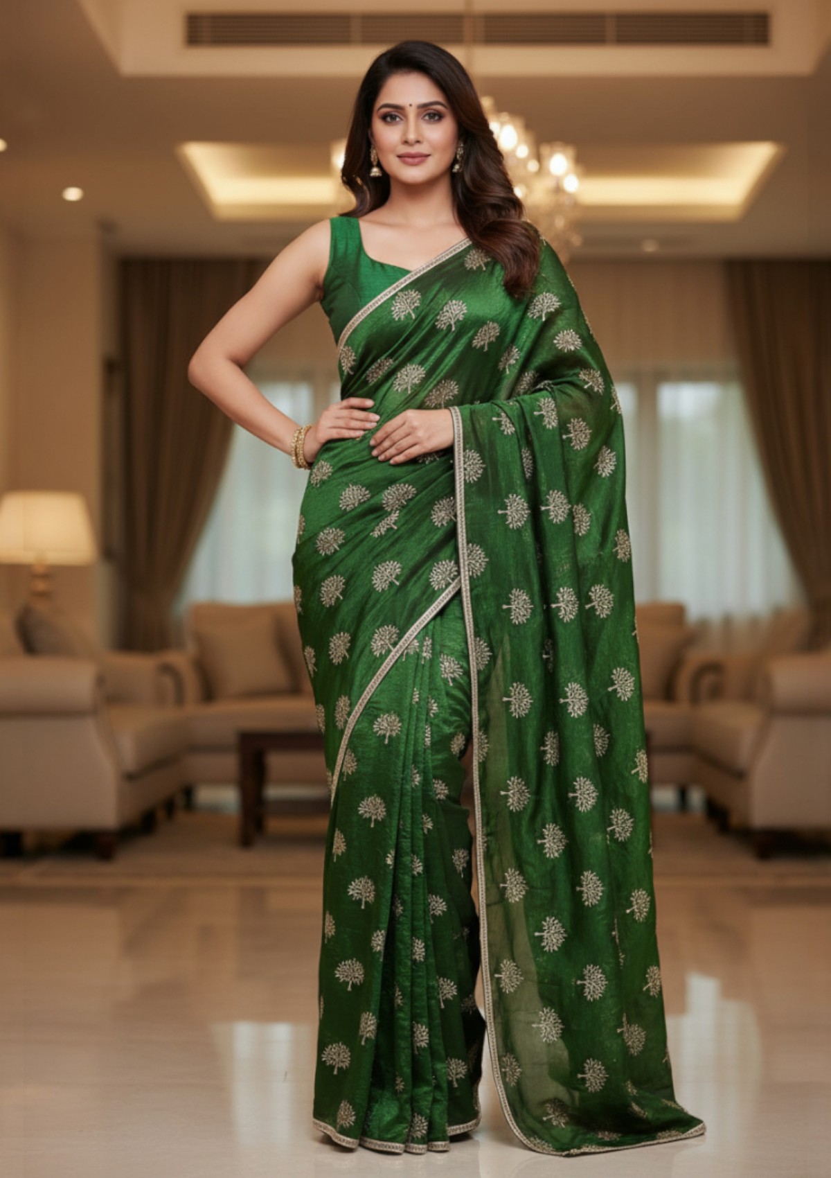Fendy Silk Saree with Stone Lace Border and Zardozi Leaf Embroidery on Body
