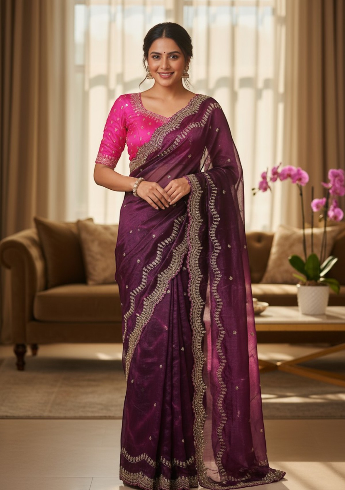 The gorgeous golden zari work with light sequins creates an unique pattern that adds to the beauty of the trendy jimmy choo fabric. This saree is perfect for all the small/big events that happens in our Indian house holds.