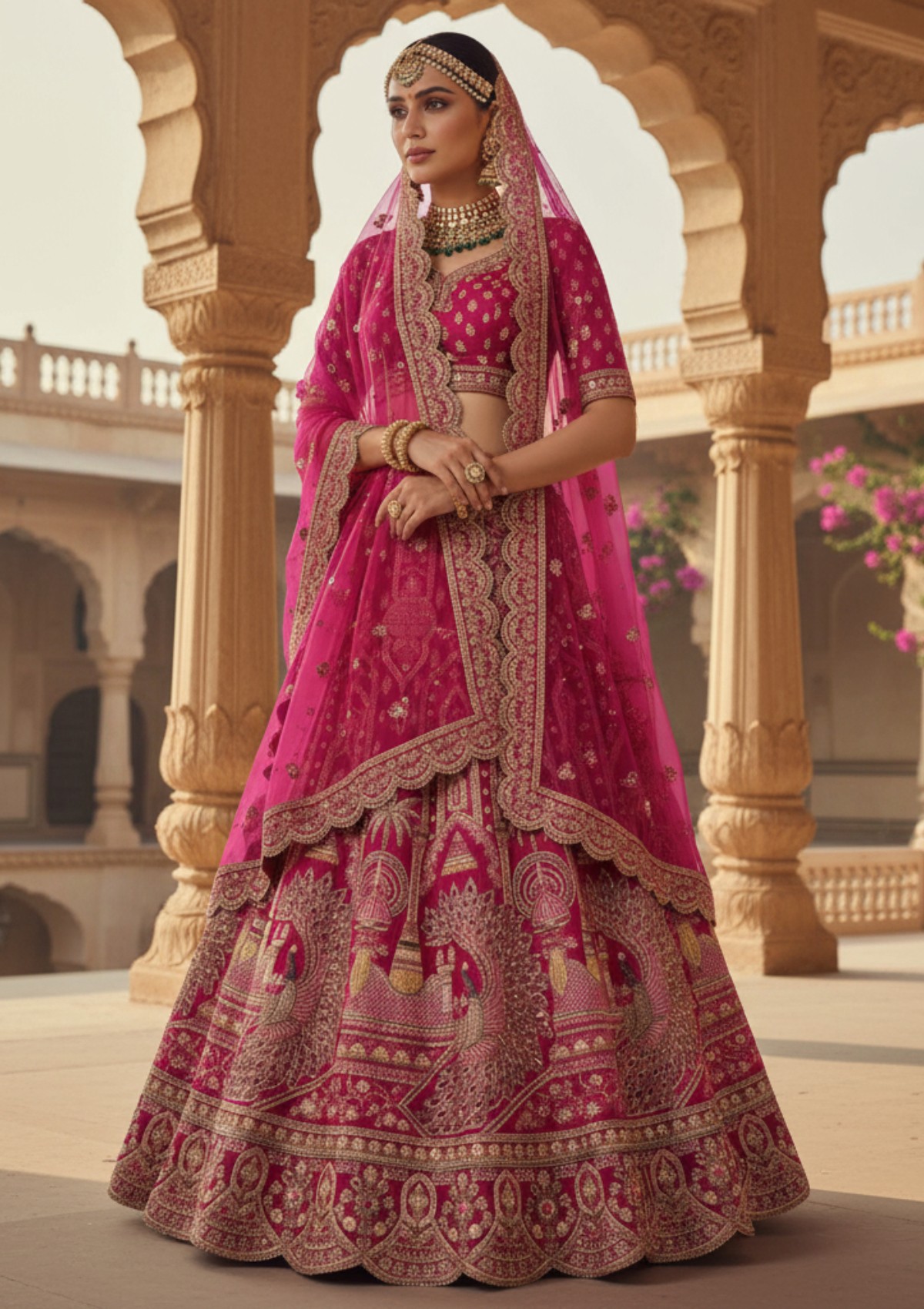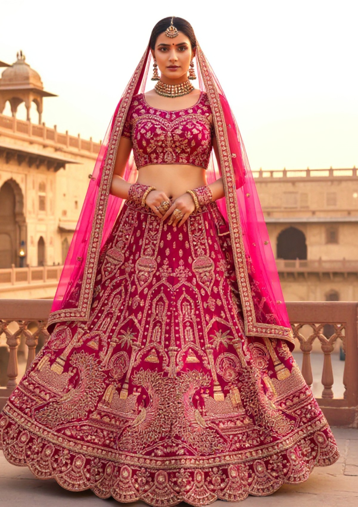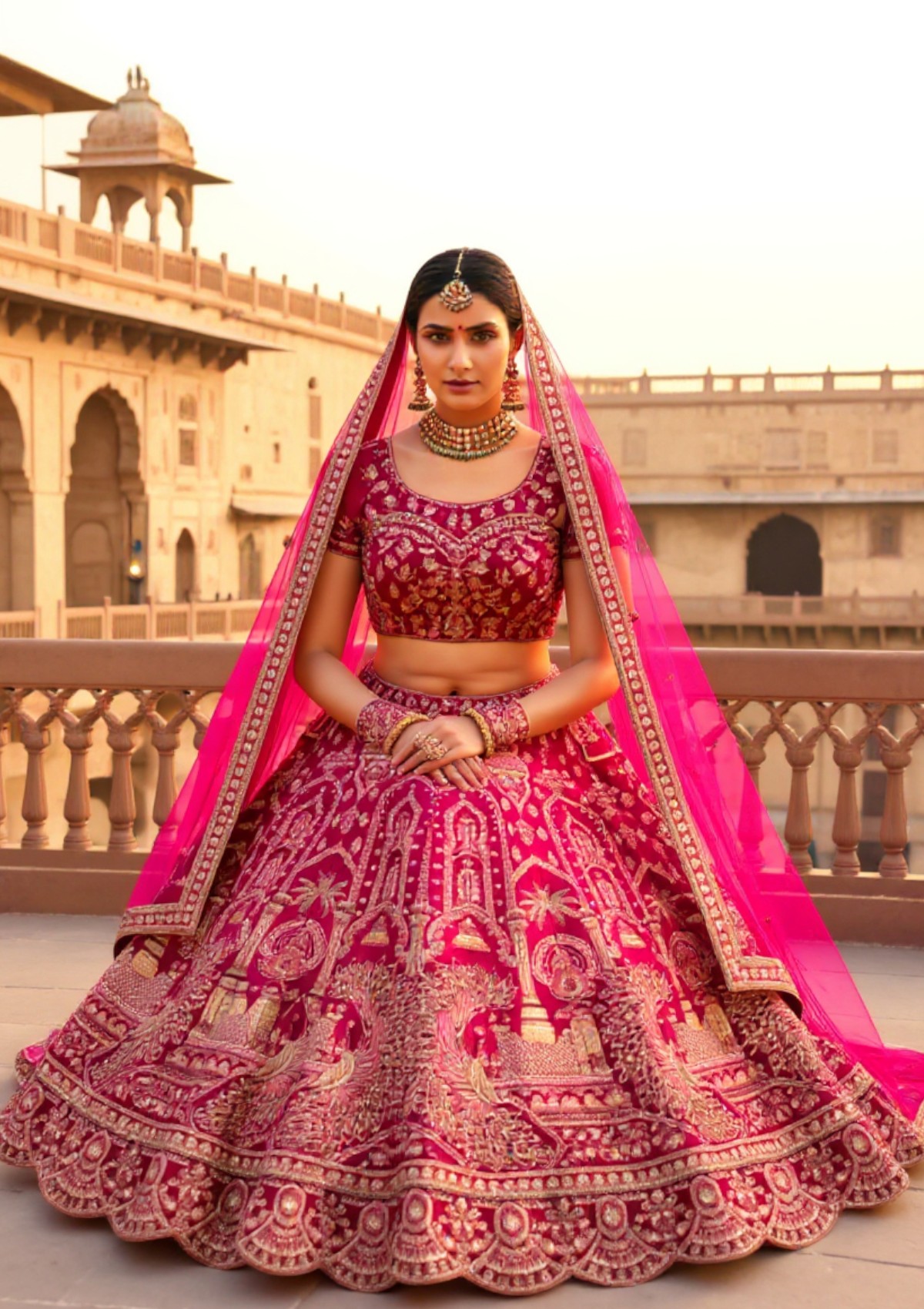 Step into a realm of majestic beauty with the Rani Pink LEHENGA, a masterpiece that speaks volumes of tradition and modern sophistication. Crafted with meticulous detail, this exquisite ensemble is designed to make an unforgettable impression.