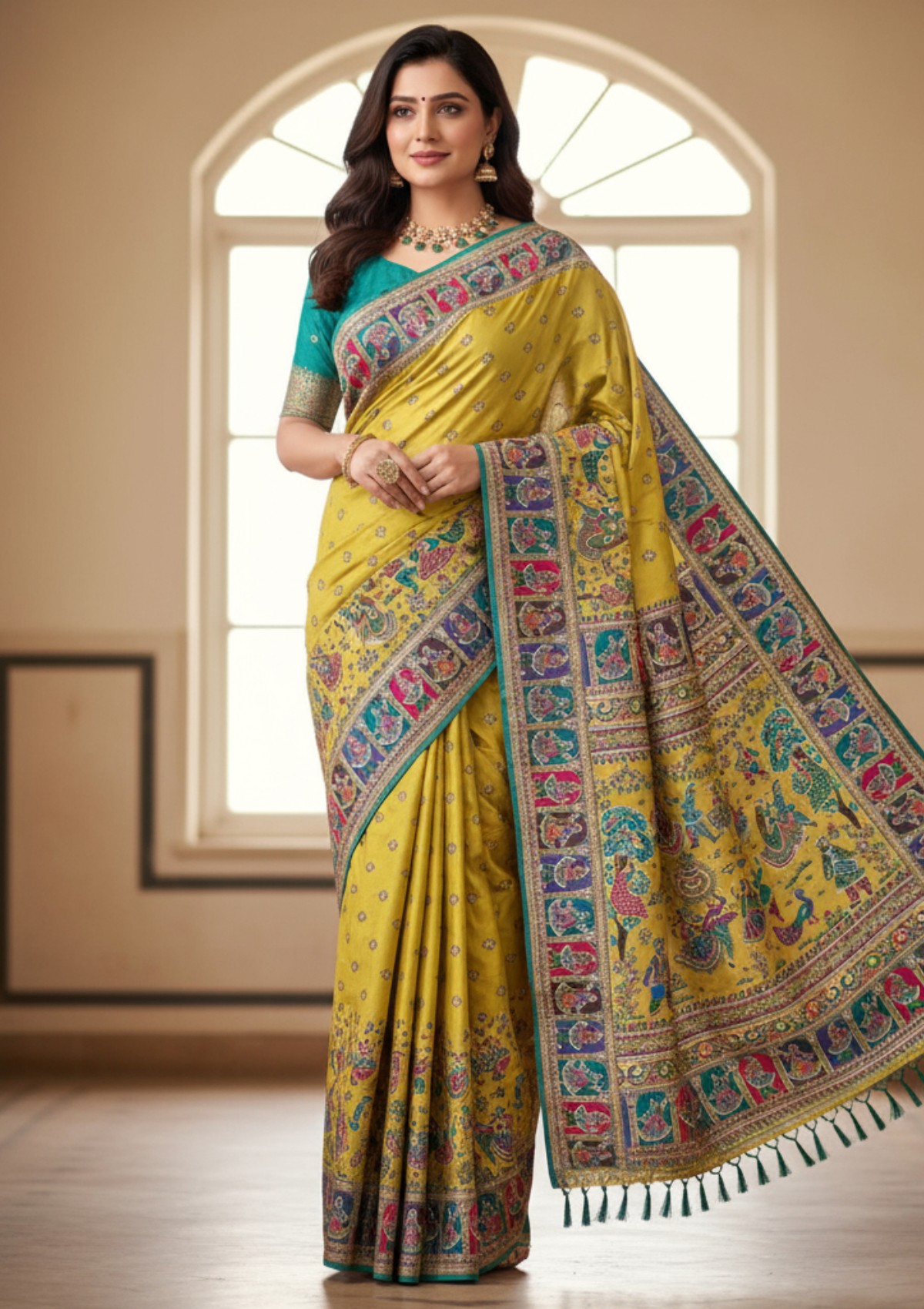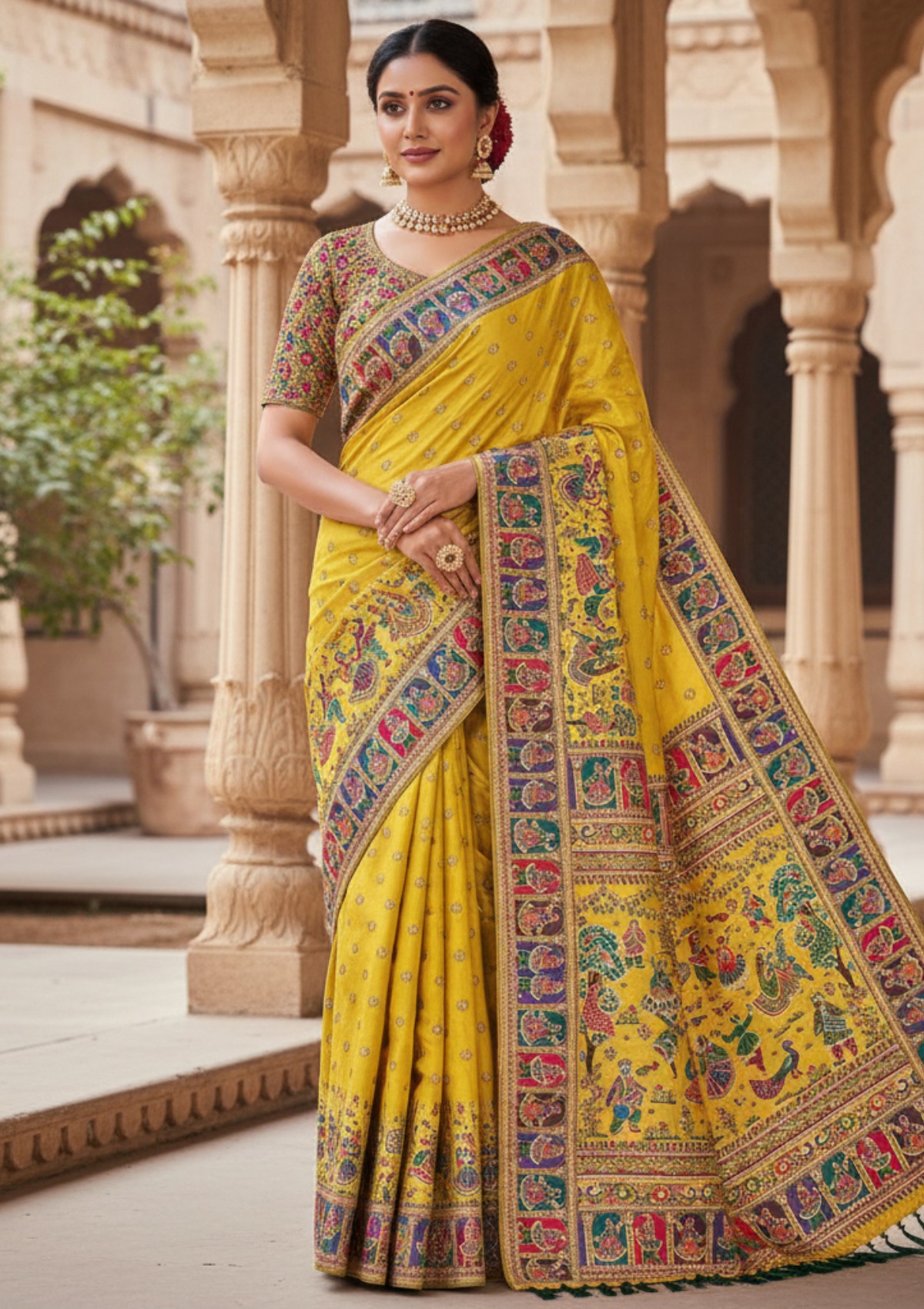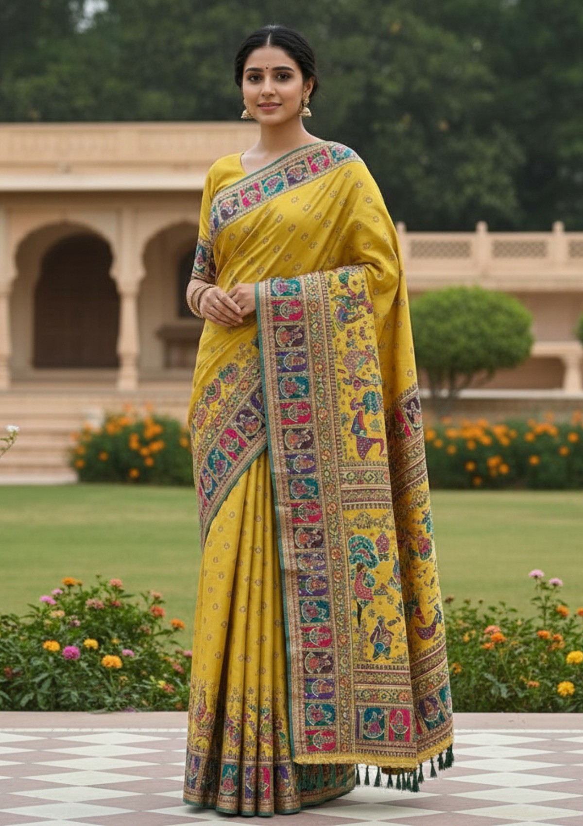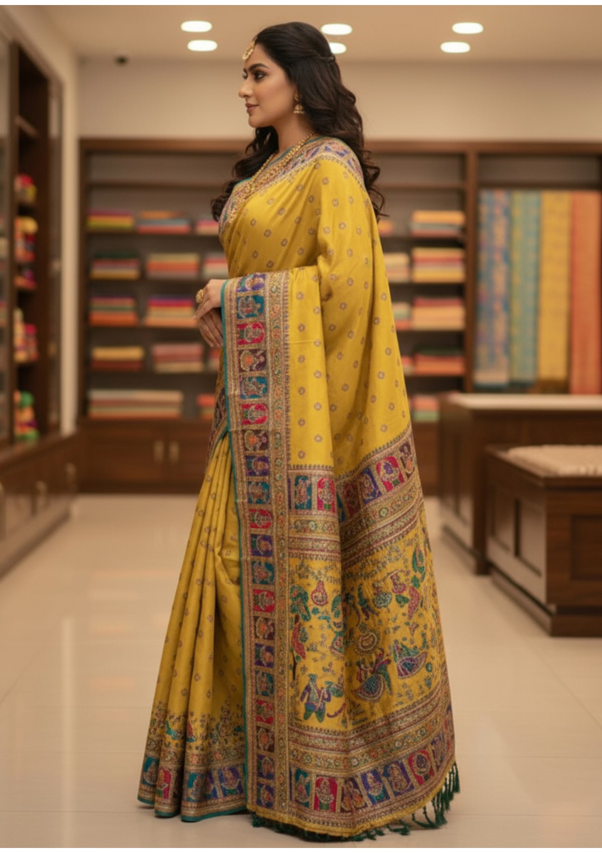Introducing the timeless elegance of our Pashmina Silk Saree, designed with colorful buttis and playful tassels to add that extra flair to your style. Imagine draping yourself in luxurious silk that caresses the skin with its softness and smoothness, while the vibrant buttis dance across the fabric, catching every eye in the room.